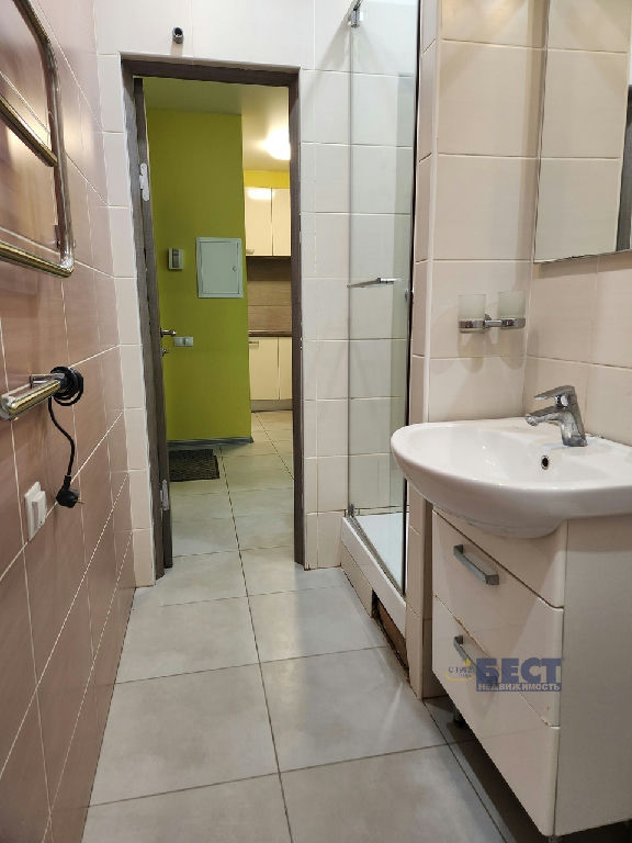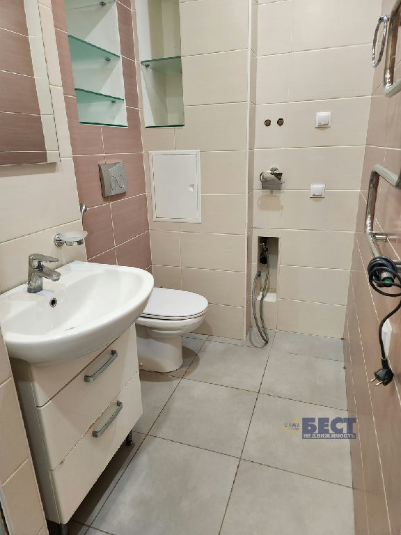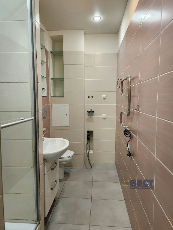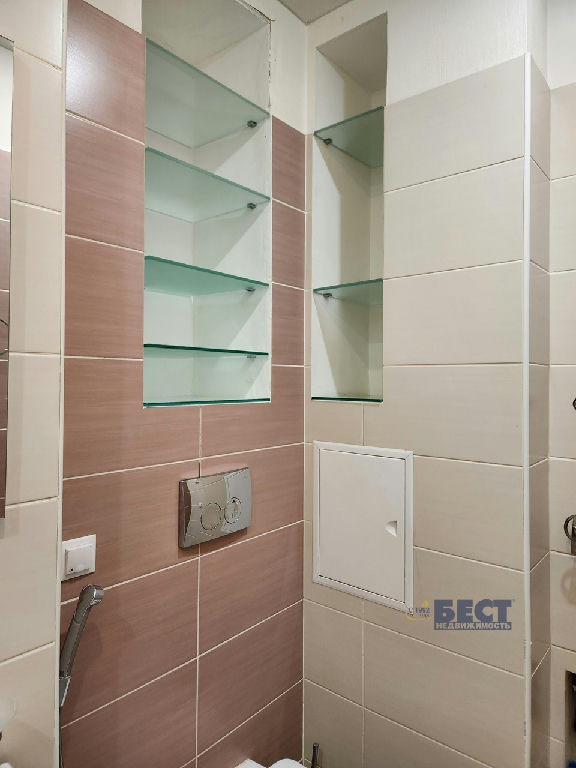 Санузел с душевой кабиной, гигиеническим душем, вытяжкой, электрическим полотенцесушителем, просторными полками для хранения моющих средств и парфюмерии, есть вывод и слив для стиральной машинки.