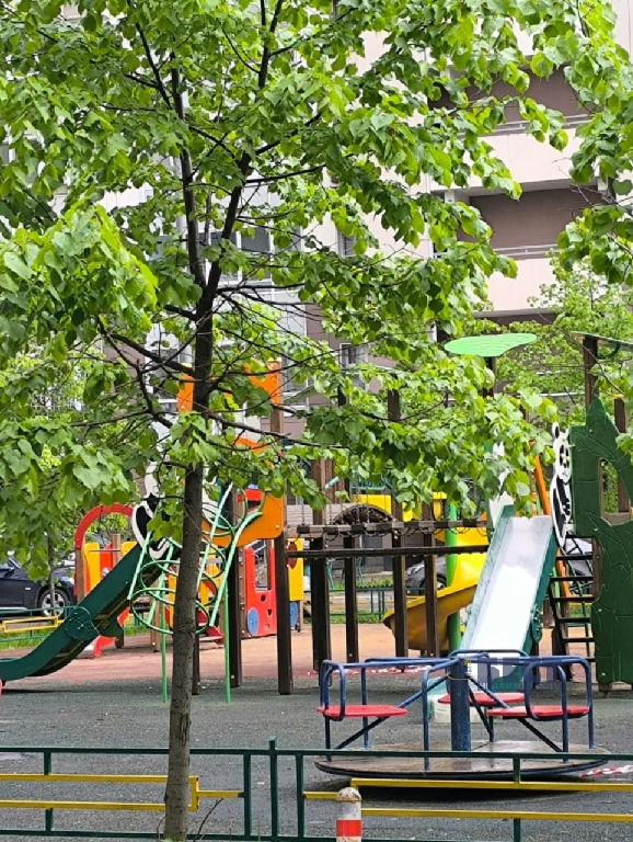 Двор оборудован детской игровой площадкой.